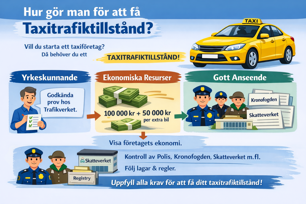 Vill du starta ett taxiföretag? Då behöver du ansöka om ett taxitrafiktillstånd. Det är Transportstyrelsen som prövar din ansökan och kontrollerar om du uppfyller vissa krav.